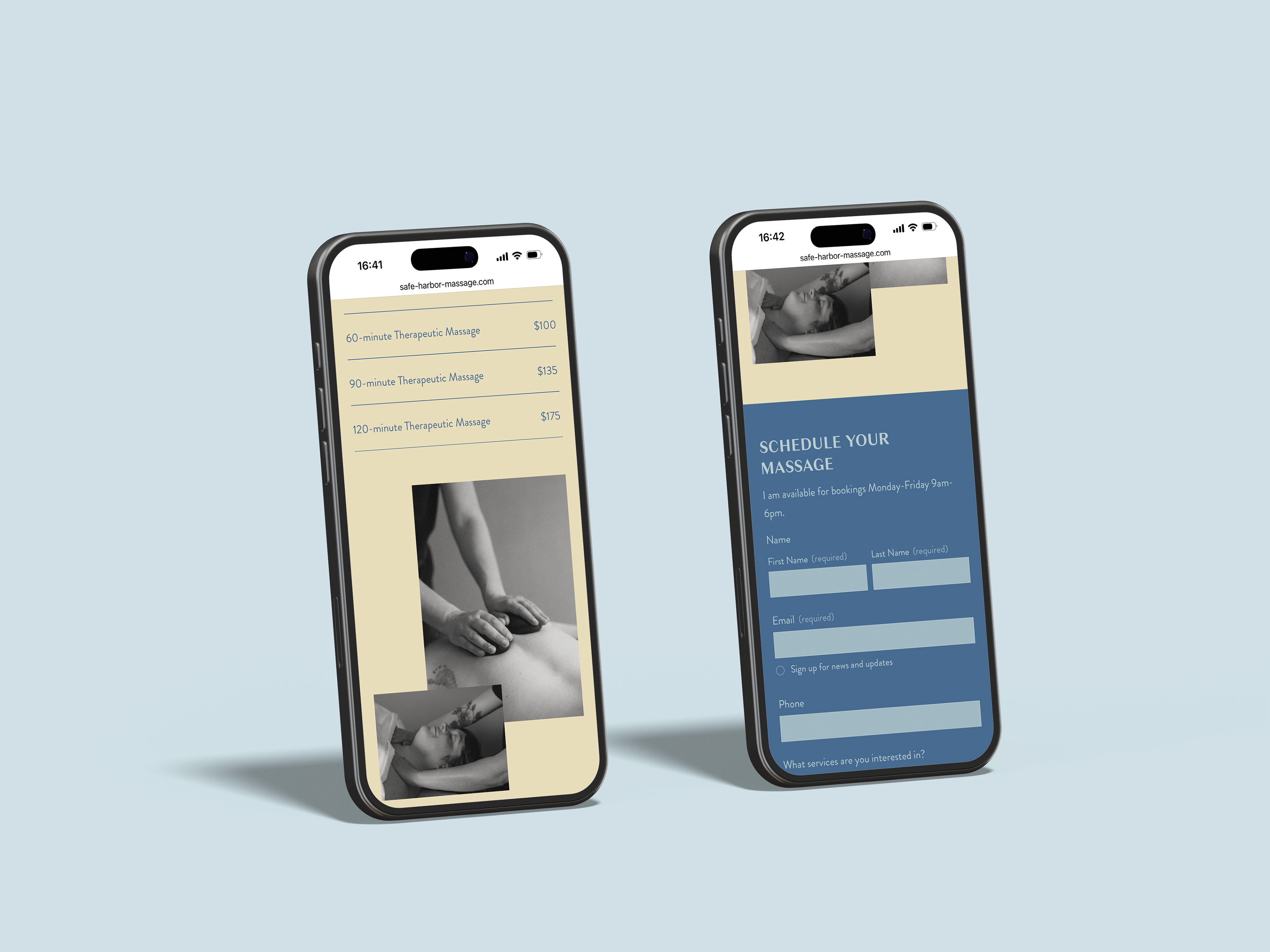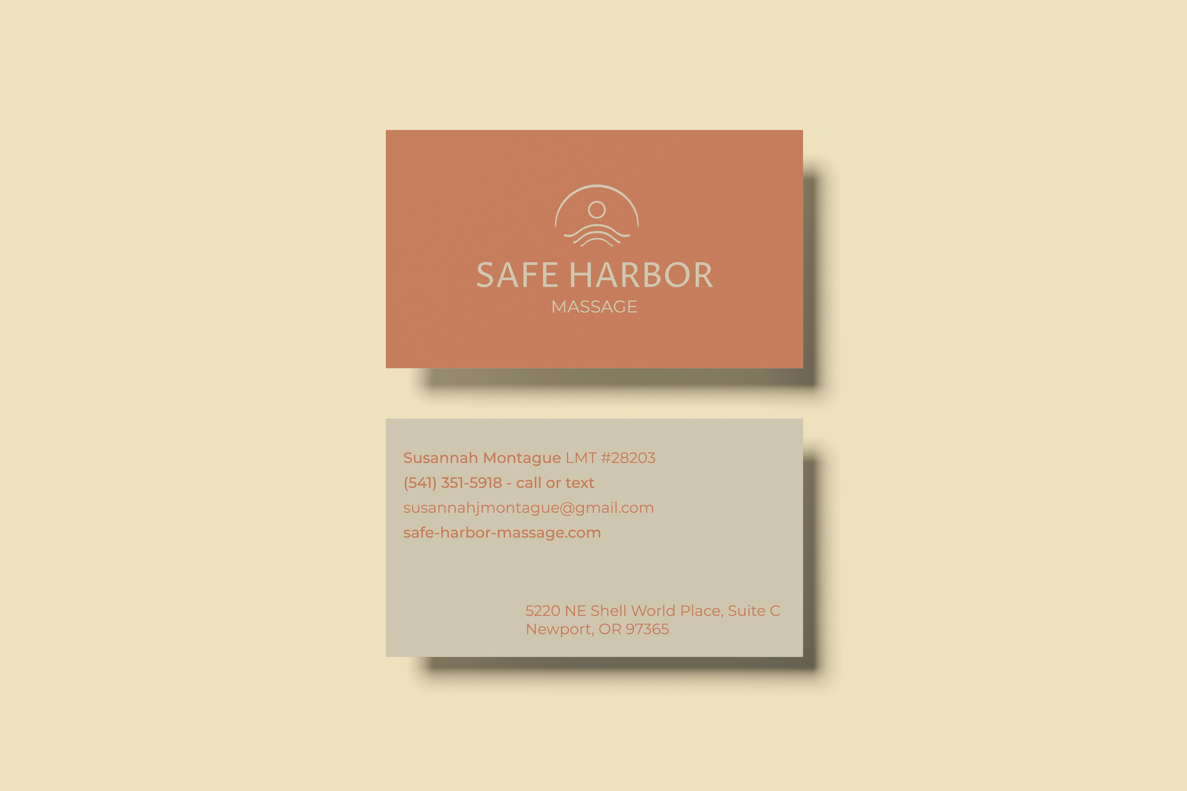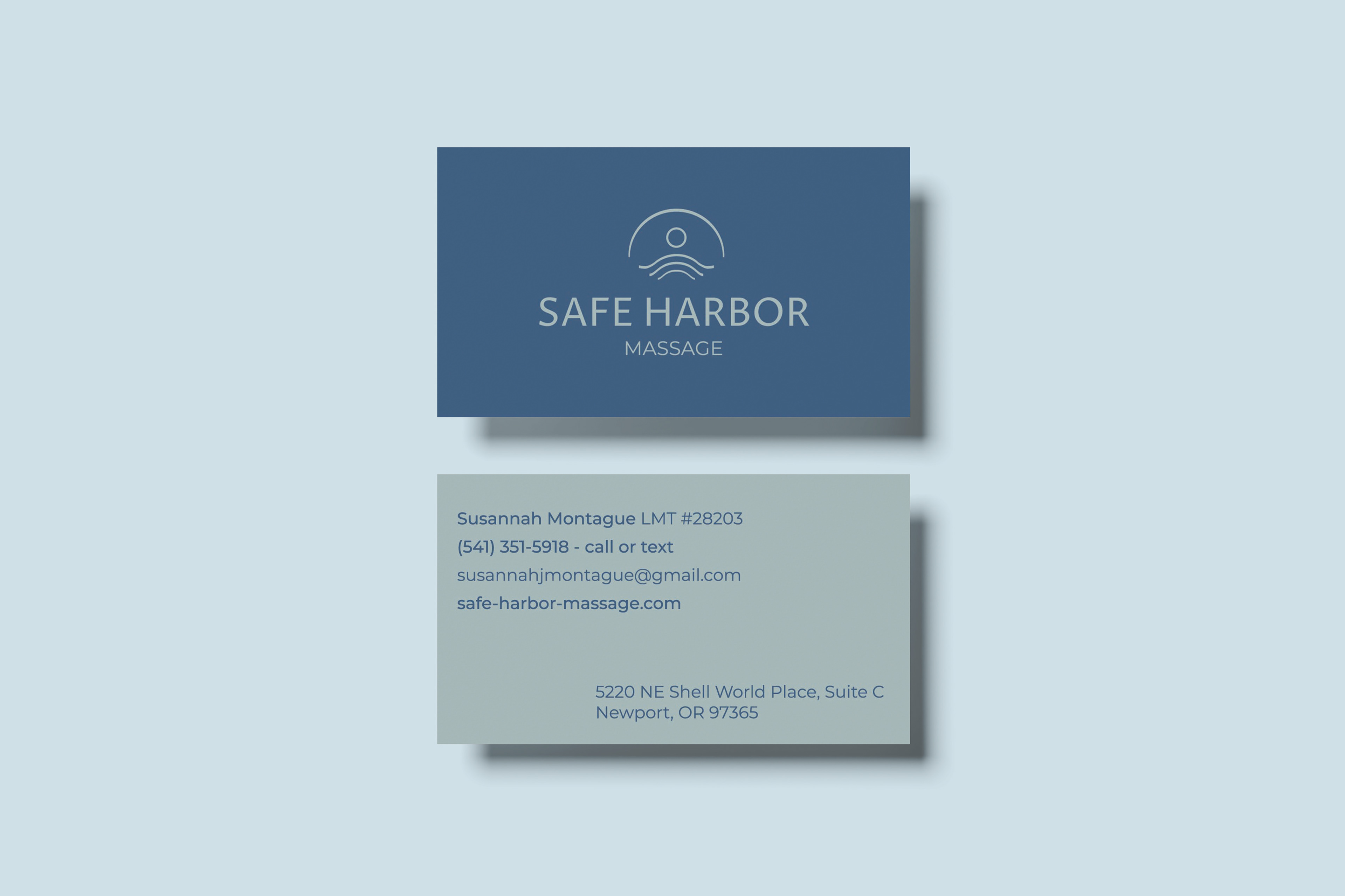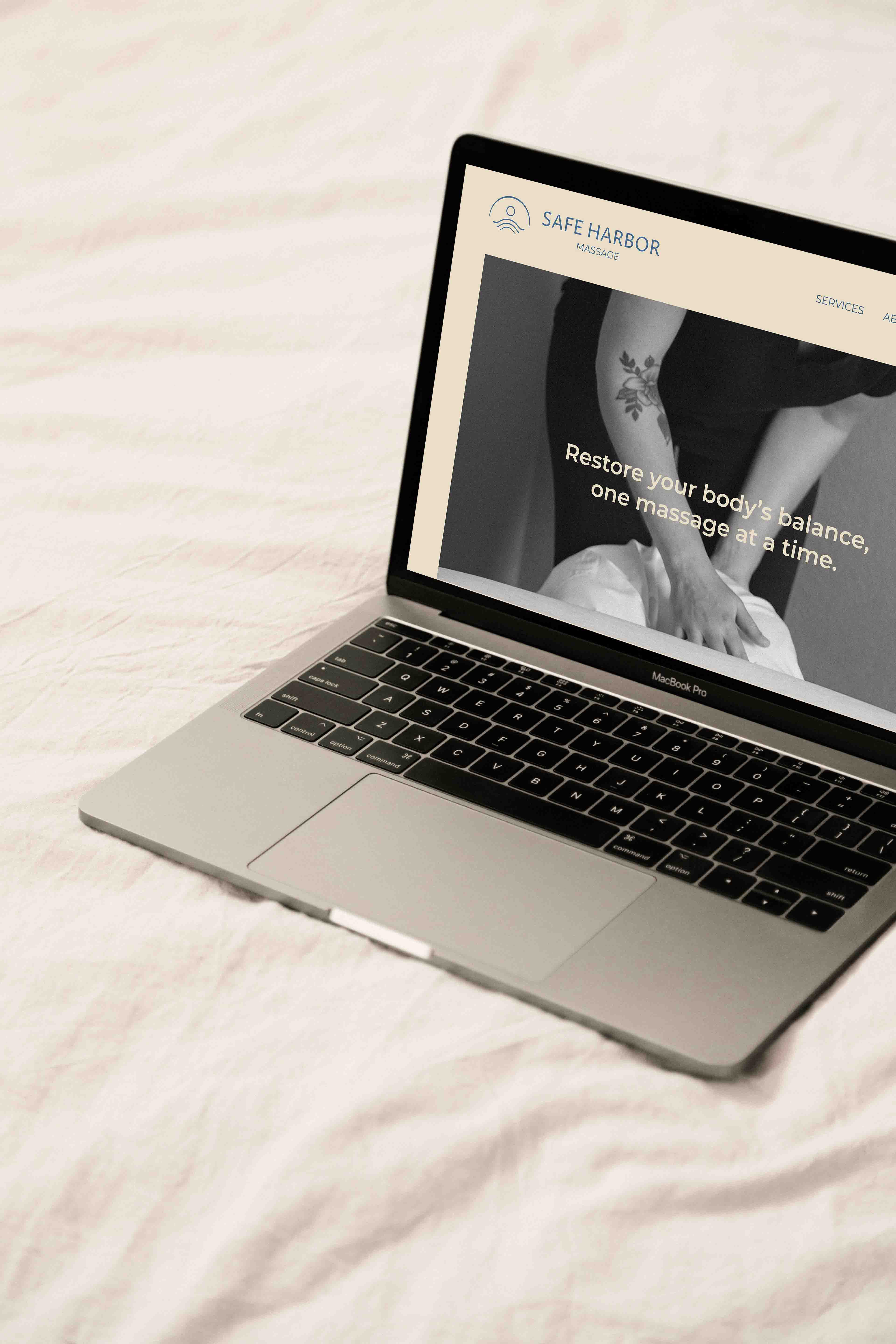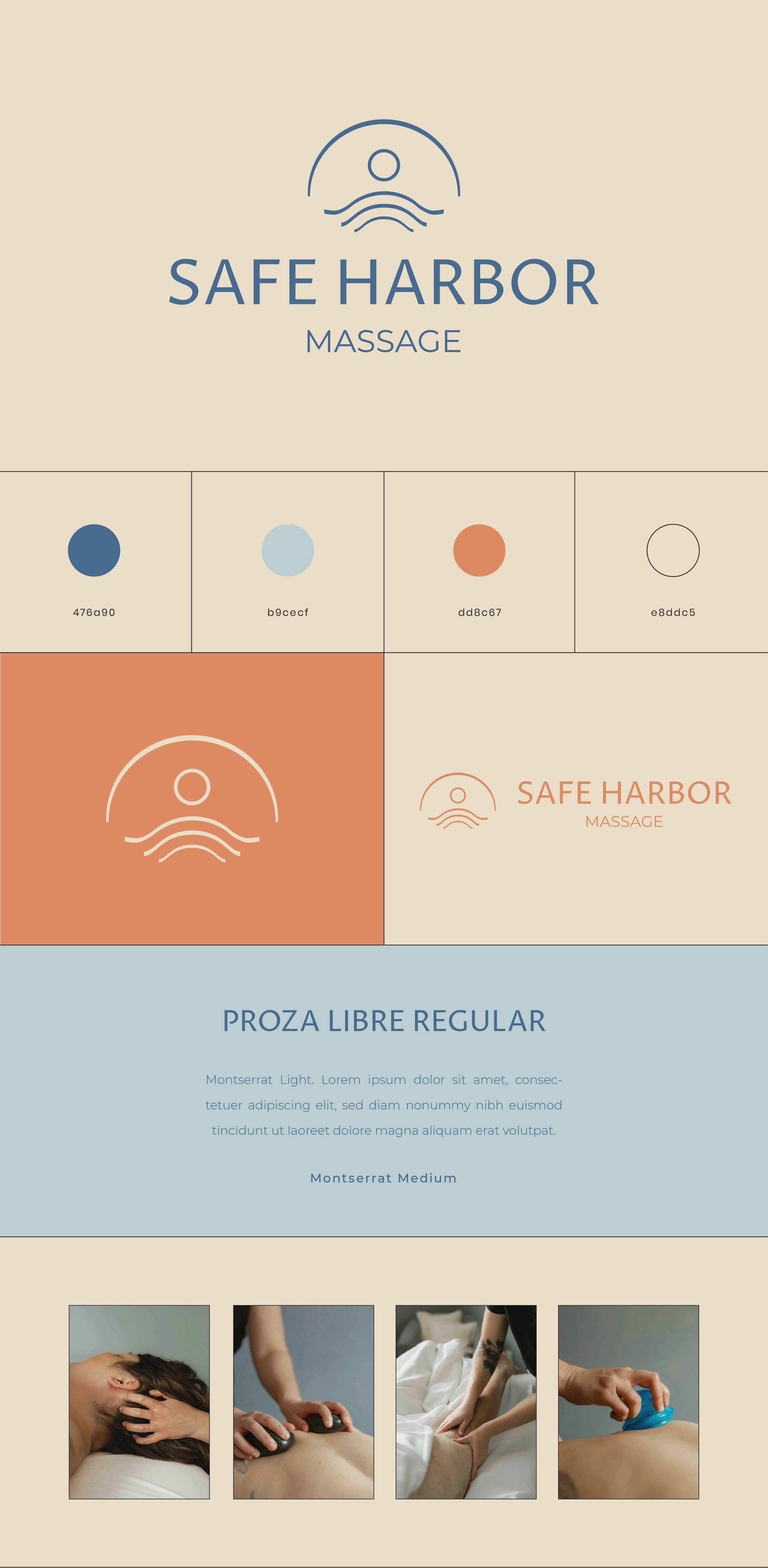 Safe Harbor Massage needed a new brand identity for their bodywork studio. They wanted it to showcase their professionalism and expertise, while evoking peacefulness. Colors were developed to embrace their ocean heritage and clinical expertise (blue), while inspiring warmth and groundedness (sandy beige).